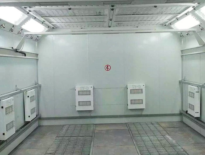整個噴烤房為拼裝式結構,房體采用子母插式保溫噴塑墻板,密封、保 溫性能好,鋁合金包邊大門,門中間裝有觀察窗,可隨時觀察房內動態;房體側面裝有工作門,方便工作人員進出,不銹鋼熱交換器,換熱效率高,使用壽命長;選用進口過濾棉、低噪音高風量風機,確保噴漆效果。噴漆房為工件噴涂提供:(1)潔凈的工作環境;(2)充分收集漆霧。 噴漆房的配置按工件大小、形狀、重量及生產綱領可有多種方式:有開式、閉式之分;有連續式、間歇式之分;有工件自轉或固定之分;有單側噴涂及雙側噴涂之分。近年又發展出油簾噴漆室、下噴漆房等。結構上應包括:送風過濾系統、工件吊掛(輸送、自轉)裝置、水簾系統、水洗系統、排風系統、水槽、照明裝置及室體。  漆霧回收的原理:漆霧回收可分成二個部分:一是噴涂工件時,漆霧與水簾碰撞混合,水簾會溶入部分漆霧落入水槽;二是未溶入水簾的漆霧經水簾板底部縫隙進入水洗室,與霧化噴嘴噴出的水霧充分混合,氣水分離沉降后流入水槽。在水槽中定期加入漆霧凝聚劑形成漆渣。